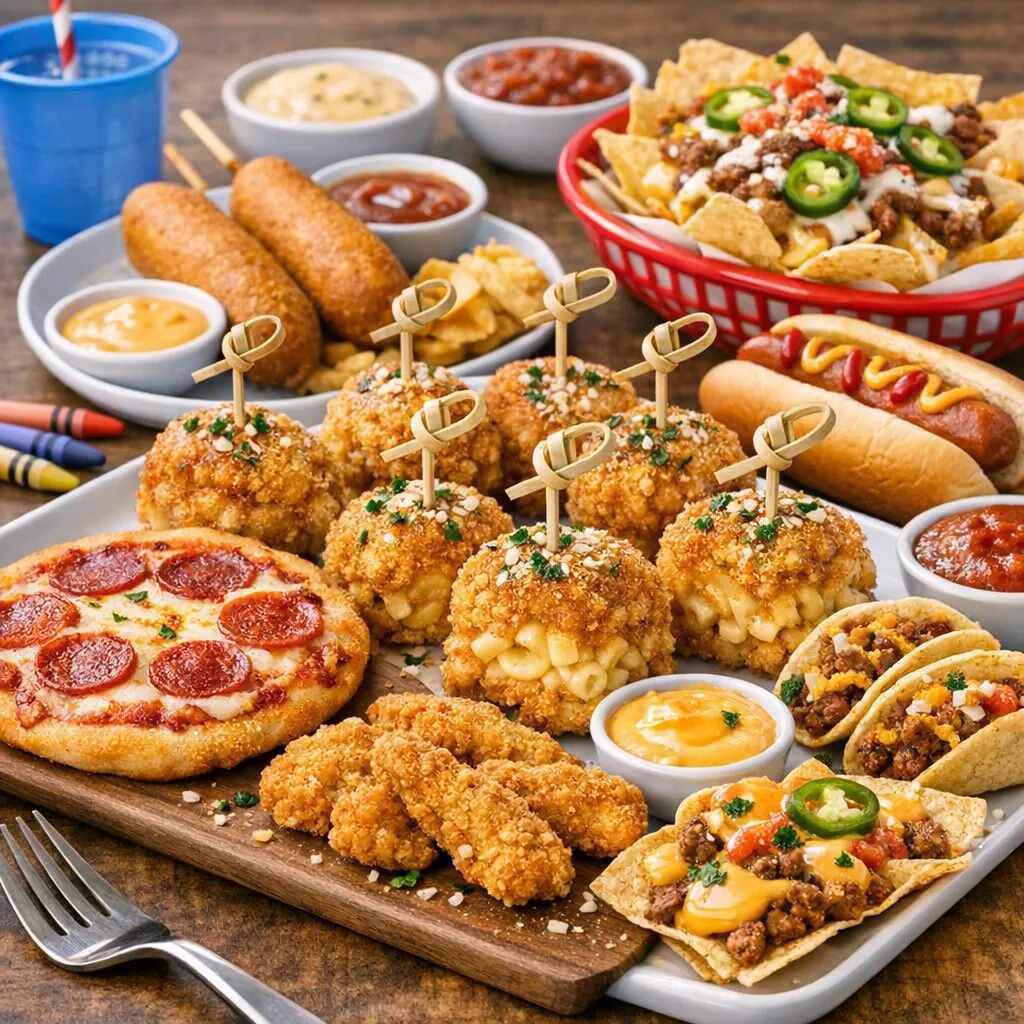 Personal Pizzas, Corn Dogs, Nachos, Hot Dogs, Mini Tacos, Cheeseburgers, Tenders, and More.