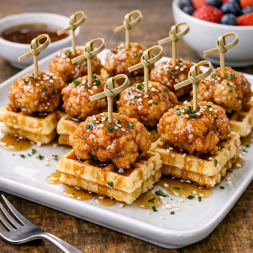 Our mini chicken and waffle hors d’oeuvres combine crispy, tender chicken with warm, fluffy waffles for a sweet‑savory bite guests can’t resist.