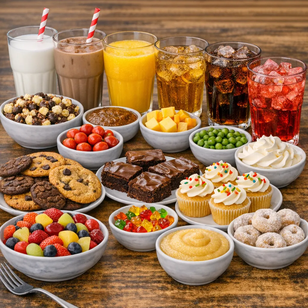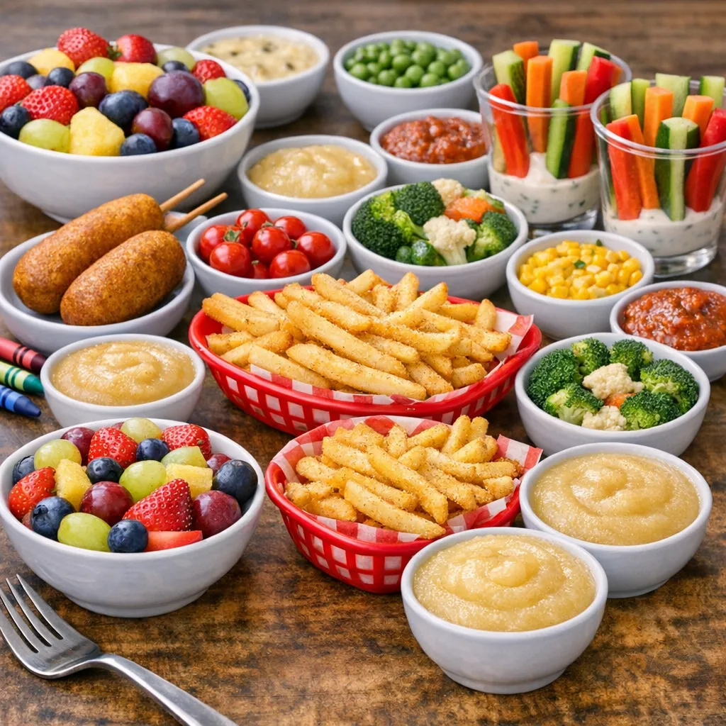 Fresh Fruits, Apple Sauce, Vegetable Cups, Mac & Cheese, French fries, and More.